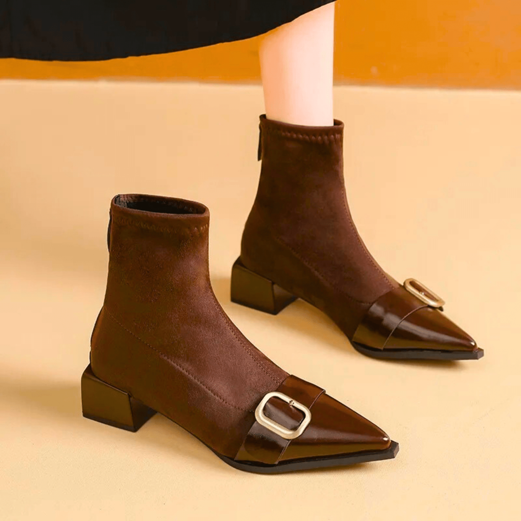 Crafted from premium suede leather, it delivers a refined contrast of texture with a sculpted silhouette and signature metallic buckle. Designed with a low block heel and smooth back-zip closure, it offers lasting comfort and timeless sophistication.
